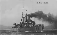 Amalfi was a Pisa-class armored cruiser of the Italian Royal Navy (Italian: Regia Marina) built in the first decade of the 20th century. During the Italo-Turkish War of 1911–1912, Amalfi operated with the Italian fleet off Tripoli in September 1911 and participated in the amphibious landings at Derna in October. In April 1912, Amalfi and sister ship Pisa led the way in attacks on Turkish forts in the Dardanelles. After the rest of the fleet retired later in the month, the pair of armored cruisers remained in the area to attack Turkish communications facilities. After the Treaty of Lausanne signed in October 1912 ended the war, Amalfi escorted the Italian king and queen on the royal yacht to Germany and Sweden during a 1913 visit.