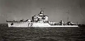 Freccia was involved in several convoy actions in the course of the war.[10] On 21 February 1941, Freccia led the escort of a three Axis merchant ships on their way back from Tripoli, Libya. In the afternoon, the British submarine HMS Regent torpedoed the German freighter Menes, which was hit amidships. Regent endured an intense depth charge attack by the destroyers Turbine and Freccia and received some damage. Menes was eventually towed to safety by the third destroyer of the escort, Freccia's sister ship Saetta.[14][15] On 11 December 1941, Freccia was escorting the transport Calitea when the Italian motor vessel was torpedoed and sunk by the British submarine HMS Talisman. Freccia counter-attacked Talisman with depth charges and rescued 230 survivors.[16] On 28 July 1942, nine Beauforts torpedo bombers from the 39 Sqn departing from Malta launched a sortie against the Italian motor vessel Monviso, escorted by Freccia and the torpedo boat Calliope in a small convoy to Benghasi. The warships and the Axis fighter escort shot down two bombers, but Monviso was badly hit. Freccia towed the merchant ship to Navarino, where she was repaired, only to sink on a minefield some weeks later.[17] On 6 September 1942, while escorting the motor vessels Luciano Manara and Ravello from Taranto to Benghasi along with the destroyers Bombardiere, Fuciliere, Geniere, Corsaro, Camicia Nera and the torpedo boat Pallade the convoy came under torpedo attack from Malta's Beauforts from the 39 Sqn. The Italian ships shot down two Beauforts and two supporting Beaufighters, not before one of the aerial torpedoes struck Luciano Manara's stern. Freccia took the motor vessel in tow, and beached her in Arillas bay, Corfu. Luciano Manara was eventually salvaged and survived the war.[18] On 29 December 1942, Freccia, fitted by then with the radar warning system Metox,[5] was lightly damaged when an aerial torpedo hit and blew up the ship she was escorting to Tunis, the transport Iseo, loaded with ammunition. After rescuing survivors, the destroyer was detached to reinforce the escort of a two-German merchant convoy.[19] While undergoing modernisation works at Genoa, Freccia was bombed and sunk at dock by RAF Lancaster bombers during an area air raid on the city on 8 August 1943. Her hull was eventually refloated and scrapped in 1949.[20]