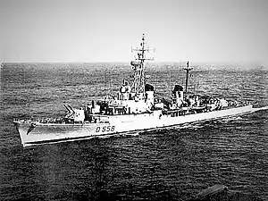 She is laid down on 7 May 1952 and launched on 16 September 1956 by Cantiere navale di Riva Trigoso. Commissioned on 25 January 1958 with the hull number D 558 and decommissioned in 1983.[1]