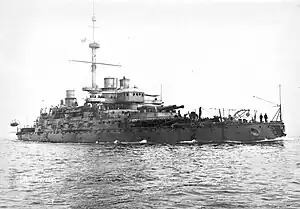 Sicilia became a depot ship for the new dreadnought battleship Giulio Cesare, which was then nearing completion at Taranto. Sicilia was stricken on 9 July 1914 and slated to be scrapped, but the Regia Marina decided to retain the ship after World War I broke out at the end of the month. On 16 August 1914, the ship was disarmed and returned to service as a depot ship in Taranto for ammunition and sailors.[19] Italy had declared neutrality at the start of World War I, but by May 1915, the Triple Entente had convinced the Italians to enter the war against the Central Powers.[20] Later in the war, Sicilia was converted into a repair ship. The ship was stricken again in 1923 and thereafter broken up for scrap.[1][19]