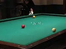 Unlike in many games, shots are always taken in rotation – the same player or team never shoots twice in a row, even if they have scored. The only exception is if the opponent fouls before shooting, such as by moving one of the balls accidentally. Play continues until one player or team wins by being the first to reach or exceed a specific number of points (usually 200 or 300). This number is agreed upon beforehand by the players.