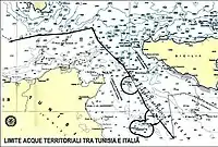 The Italy–Tunisia Delimitation Agreement is a 1971 treaty between Italy and Tunisia in which the two countries agreed to delimit a maritime boundary between them in the continental shelf.[1] The text of the treaty sets out a complex boundary in the Strait of Sicily representing an equidistant line between Sicily and Tunisia, with the exception of Pantelleria and the Pelagie Islands (Lampedusa, Linosa and Lampione). The maritime boundary around these islands, all closer to Tunisia, is made up of 13-nautical-mile[2] arcs of territorial sea centered on each island which join one another and the equidistant line at the center of the Channel of Sicily mentioned above.[3][4]