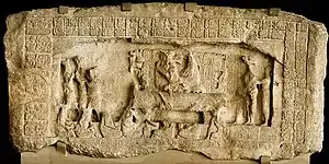 Itzam Kʼan Ahk II's reign was one marked by "hegemony over neighboring kingdoms".[6] The ruler died on November 26, 757 AD (9.16.6.11.17 7 Kaban 0 Pax) and was buried three days later.[1][7] According to Panel 3, the burial took place at the mythical "'mountain' of ho janaab witz", which in this context referred to Pyramid O-13.[7] Itzam Kʼan Ahk II was succeeded by Yoʼnal Ahk III on March 10, 758 AD.[8] Itzam Kʼan Ahk II's burial site was venerated by the succeeding kings of Piedras Negras, which has led some to hypothesize that Itzam Kʼan Ahk II produced a new ruling dynasty, and that the following three kings—Yoʼnal Ahk III, Haʼ Kʼin Xook, and Kʼinich Yat Ahk II—were his sons.[7][8][9][10][11]