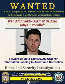 The U.S. State Department's Rewards for Justice Program offers a $10 million reward for information leading to the arrest and/or conviction of Iván Archivaldo Guzmán Salazar.[1]