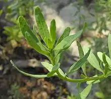 Iva hayesiana is a shrubby perennial herb approaching one meter (40 inches) in height. Its green oval-shaped leaves are fleshy, glandular, aromatic, and 3 to 6 centimeters (1.2-2.4 inches) long.[3]