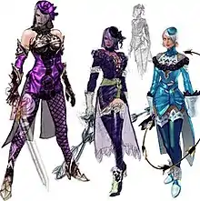 Ivy's alternate character designs in the games are a contrast to her primary designs, with the secondary from Soulcalibur to Soulcalibur III consisting of countess attire of either blue or red pants, vest, and jacket, with white boots covering her feet and her hair combed back. In Soulcalibur II, a tertiary alternate design was added consisting of a red leotard and gloves with gold trimming, with red stockings on her legs; in addition, a fourth design resembling her appearance at the conclusion of Soulcalibur was considered, incorporating a cloak and the symbol of caduceus on the front of her leotard cupping her breasts, but was unused.[21] In Soulcalibur III, a long, rose-themed dress with hat and veil was used as a tertiary alternate, one of several considered designs.[22] For Soulcalibur IV, a similarly themed black dress was used as her sole alternate design for the game.[19]