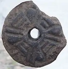 The Malacates are all artifacts of primary class ceramic artifacts. Decoration on its upper side, many of them are flat on the bottom section, but the shape -all are circular- is variable in their section. In the past, (in Chiapas), it was mentioned that some Malacates were tapered, flat and mixed[29] existed.[28] Its most definite function, more than any of the remaining ceramic artifacts, always considered as spindle whorls. However, as a secondary or alternate function could also serve as necklace beads.[28]