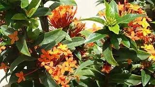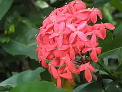 Ixora coccinea (also known as jungle geranium, flame of the woods or jungle flame or pendkuli) is a species of flowering plant in the family Rubiaceae.[1] It is a common flowering shrub native to Southern India, Bangladesh, and Sri Lanka. It has become one of the most popular flowering shrubs in South Florida gardens and landscapes.[2][3] It is the national flower of Suriname. Commercially important medicinal plant, used in ayurveda. All parts including flower, leaves and root are taken for various medicinal preparations for skin disease, Diabetes etc