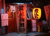 The word izakaya entered the English language by 1987.[3] It is a compound word consisting of iru ("to stay") and sakaya ("sake shop"), indicating that izakaya originated from sake shops that allowed customers to sit on the premises to drink.[4] Izakaya are sometimes called akachōchin ('red lantern') in daily conversation, as such paper lanterns are traditionally found in front of them.