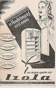 Izola produced equipment for the Greek military during preparations after the outbreak of World War II, while during the Axis occupation its facilities were used by the occupying powers for vehicle repair and maintenance. It recovered soon after the war and in 1951 it introduced its first electric home appliances. Soon an extended range of products was introduced (kitchen ovens, refrigerators, freezers, heaters, TV sets etc.) and the company became a legendary success story in Greek industrial history. These were the times of the Greek economic miracle and industries like Izola benefited greatly from improving living standards. Izola was a classic case of a brand name associated in people's minds with progress, modernity and a more comfortable life. Its demise, however, is equally spectacular and is in a way representative of the sad evolutions in Greek industry in general, after 1980. The beginning of the end came with the disastrous merger with Eskimo, a former competitor, in 1977, after the company had already started facing some economic problems. The new company (Elinda, for [H]ellenic Industry of Appliances) was a financial ruin only a few years later, and in 1991 it effectively went out of business altogether. Today, a huge, idle and run-down factory near Thiva bears testimony to the downfall of one of Greece's most beloved and (once) successful brand names.