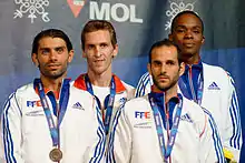 After the dissolution of Team Lagardère in 2012, Cadot went back to his formative club and resumed training under his childhood coach. He was selected into the national team again and in the beginning of the 2013–14 season he reached the final at the Paris World Cup.[3] At the European Championships in Zagreb he reached the table of 16, where he was defeated by four-time World champion Peter Joppich after leading 14 to 11.[4] At the World Championships in Budapest, he was stopped in the second round by Race Imboden of the United States. In the team event, France met the United States in the semi-finals. With a 32–26 lead, Cadot and Enzo Lefort crumbled against Gerek Meinhardt and Race Imboden. France was finally defeated 35–45.[5] They however prevailed over Russia to win the bronze medal, Cadot's first World podium. He finished the season No.25 in world rankings, a career best as of 2014.