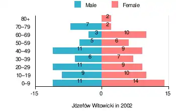 According to the 2002 Poland census, there were 132 people residing in Józefów Witowicki village, of whom 47.7% were male and 52.3% were female. In the village, the population was spread out, with 31.1% under the age of 18, 37.9% from 18 to 44, 13.6% from 45 to 64, and 17.4% who were 65 years of age or older.[1]