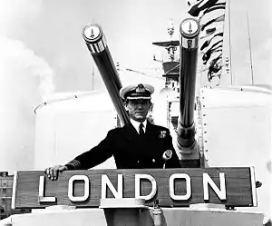 In 1948 he was one of only three Polish officers to be accepted into the RN out of several hundred who volunteered.[3] It meant relinquishing his wartime rank of lieutenant-commander, and he was appointed to the battleship Anson as a lieutenant with seniority from July 1941. His draft to Anson was nearly rescinded when her captain noticed that Bartosik dared to sport his Polish Virtuti Militari ahead of his British DSC. He was dispatched to serve on escort vessels. From 1955 to 1958 he was the commander of the frigate HMS Comus. From September 1959 he led the 5th Frigate Squadron from HMS Scarborough. From 1962 to 1963 he was commander of Royal Naval Air Station RNAS Culdrose. From 1964 to 1965, he commanded the guided missile destroyer London, and from 1966 to 1968 he was Assistant Chief of Naval Staff (Operations). In 1969, he retired with the rank of rear admiral.