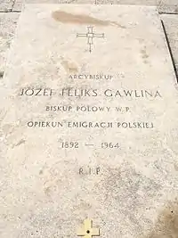 Józef Feliks Gawlina, born in 1892 in Strzybnik (Racibórz County) in Silesia - died 1964 in Rome was a Divisional general in the Polish Armed Forces. He was an ordained priest, Doctor of Theology and from 1933, Catholic bishop in the Military Ordinariate of Poland.[1] After the Second world war, cardinal Hlond gave him the brief to provide pastoral care to the Polish diaspora. In the words of Pope John Paul II, Gawlina was a "bishop - Nomad". He was raised to the rank of Archbishop in 1957. Following his death, the Secretary General of the Second Vatican Council described him as a "real pastor".