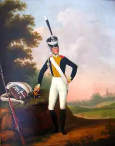 In 1812, Łukaszewicz enrolled in the Vilnius University and began studying in its art school, where he studied painting as a pupil of Jan Rustem.[1] When the French invasion of the Russian Empire began in summer 1812 and the Grand Armée liberated Vilnius, Łukaszewicz joined Napoleon's Imperial Guard and was an uhlan of the 3rd Lithuanian Guard Lancer Regiment.[1][3] Its commanding officer, General Jan Konopka, and some of the regiment's soldiers were taken prisoner at the battle of Slonim in 1812. Together with the Grand Armée's remnants, the soldiers from the broken regiment, including Józefat Łukaszewicz, retreated to the Kingdom of Saxony.[4] Łukaszewicz was wounded in the Battle of Leipzig, in late October 1813.[3] Thereafter, he was released from the army due to his weak health and he went to Warsaw.[5] The sick Józefat was cared for by an uncle Jan Baranowski, who lived in Warsaw, a well-known violin maker and manufacturer of musical instruments. He lived there until his death since 1813.[1][1]