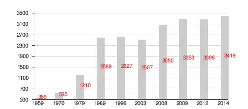 | Population | 369 | 535 | 1210 | 2589 | 2627 | 2507 | 3050 | 3250 | 3396 | 3419 |