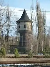 The listed water tower, built between 1915 and 1917, is located in the western part of the site. It is a red-brick building, tapering upwards, with a reservoir room with wrought-iron decorations. Its technical equipment was maintained even after the end of its use as a water tower. The heritage-listed monument is one of the few preserved technical monuments in Jüterbog.[15]