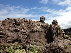 The Jūroku Rakan Iwa (十六羅漢岩) or "Sixteen Rakan Rocks" is a monument to the local fishermen in Yuza, Yamagata Prefecture, Japan. Carved from volcanic rock by a Buddhist monk between 1864 and 1868, there are in total twenty-two figures: the Sixteen Arhats along with Shakyamuni, Manjusri, Fugen and his consort, Avalokitesvara, and the Sarira. A little to the south of the carvings is Dewa Futami, or the Wedded rocks of Dewa Province.[1][2]
