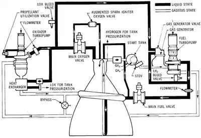 Start sequence was initiated by supplying energy to two spark plugs in the gas generator and two in the augmented spark igniter for ignition of the propellants. Next, two solenoid valves were actuated; one for helium control, and one for ignition phase control. Helium was routed to hold the propellant bleed valves closed and to purge the thrust chamber LOX dome, the LOX pump intermediate seal, and the gas generator oxidizer passage. In addition, the main fuel and ASI oxidizer valves were opened, creating an ignition flame in the ASI chamber that passed through the center of the thrust chamber injector.[2]