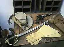 As the 5th Michigan Cavalry streamed in retreat past Stuart, a dismounted Union private, 44-year-old John A. Huff, turned and shot Stuart with his .44-caliber revolver from a distance of 10–30 yards.[74] Huff's bullet struck Stuart in the left side. It then sliced through his stomach and exited his back, one inch to the right of his spine.[75] Stuart fell into the arms of Company K's commander Gus W. Dorsey. Dorsey caught him and took him from his horse. Stuart told him: "Dorsey...save your men." Dorsey refused to leave him and brought Stuart to the rear.[76][77][78]