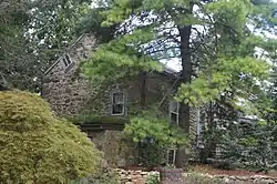 The J. K. Apgar Farmhouse was constructed in two major sections. The oldest section of the house was built in the 18th century, and the original owner and architect are unknown. The newer part of the house was constructed by J.K. Apgar in 1833. The house exemplifies the stone farmhouses constructed in Hunterdon County during this time period. The house is also notable for its unusually placed windows on its western face; locals referred to it as the "cock-eyed house" due to the way the two windows align with the roof pitch. At the time of its nomination, it was one of the five oldest extant buildings in Califon. The nomination form noted that some modern elements had been added to the farmhouse and its grounds; there were a few modern outbuildings, and a one-story wing was added to the farmhouse in the 1970s.[3]
