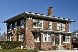 The J. T. and Mollie Crozier House is a historic building located in Chariton, Iowa, United States. James Thomas Crozier was a native of Barnsfield, Ohio who settled here in 1878. He clerked in D.D. Waynick's store before he opened his own general store on the town square. The store remained in business until his children retired in 1974.[2] This house replaced the family's former residence that had been destroyed in a March 1918 fire. Crozier hired local architect William L. Perkins to design this house. It is the earliest known residential example of his work.[2] The two-story brick structure shows influences of the American Craftsman and Prairie School styles. The Prairie School is found in the house's horizontal orientation, the lowpitched hip roof, broad eaves, paired windows, the two brick belt courses, and the solarium on the south elevation. The Craftsman influences are found in the French doors, built-in cabinets, and paneling on the interior. Bricks from the house that was destroyed as well as the broad window in the first floor study, its fireplace mantel, and the kitchen windows were reused in this house.[2] It was listed on the National Register of Historic Places in 2011.[1]
