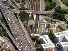 JFK/UMass station is located south of Columbia Road near Kosciuszko Circle, with the Interstate 93 viaduct to the south and west and Morrissey Boulevard to the east. The Red Line has four tracks and two island platforms at the station; the west platform is served by the Ashmont branch, and the east platform by the Braintree branch.[47] (This unusual configuration is the result of the decision to not originally have the Braintree Branch stop at the station.)[6][31] East of the Red Line is a single track used by the three commuter rail lines, with a high-level side platform on its east side.[47] A two-lane busway, drop-off lane, and plaza are located east of the tracks.[20]