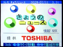 Experimental broadcasts started on October 3, 1983, by NHK in Tokyo and Osaka using the "pattern method".[3][5][6] This included subtitles and other so called "supplementary" or "independent programs", where information unrelated to the TV program being show is displayed.[7] For example, at the time of the Great Hanshin Earthquake, information about vital services and victim names was broadcast for days.[7] To accompany the introduction of the system, Sony released the "TXT-10" decoder with a cost of 119,000 yen, and Sharp released "21C-L1", a TV with a built in decoder.