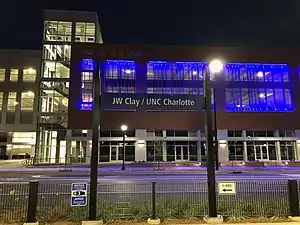 JW Clay Blvd/UNC Charlotte is a light rail station on the LYNX Blue Line in Charlotte, North Carolina, United States. It is located on North Tryon Street at JW Clay Boulevard in University City. The station consists of a single island platform in the street's median, connected via pedestrian overpass to both sides of North Tryon Street and to an adjacent parking garage. The parking garage charges a flat weekday fee for all riders that do not have a one-day, weekly or monthly pass.[3] JW Clay Blvd/UNC Charlotte station is west of the University of North Carolina at Charlotte campus and is near Jerry Richardson Stadium. The station opened on March 16, 2018.[4]