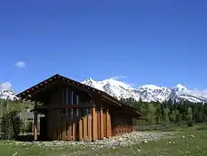 Mr. Rockefeller hoped that his project would serve as a model for the National Parks. The overall plan for the preserve was developed by D. R. Horne & Company with advice regarding user experience from Kevin Coffee Museum Planning. Prerequisite to creating the LSR Preserve, the cabins, stables and other built environment that had been part of the Rockefeller family's presence at the JY Ranch were removed and those sites were carefully bio-remediated with seeds or plantings collected from nearby locations within the site. A nine-mile system of hiking trails lead through sub-alpine and wetland habitat, with vistas along the southern edge of Phelps Lake. The visitor experience is prompted via the 7,573 ft2 (704 m2) visitor center situated at the lowest elevation of the Preserve. The visitor center building was designed by Carney Architects of Jackson, Wyoming with the Rocky Mountain Institute consulting on energy and daylighting analysis. Hershberger Design prepared the landscape design plan for the visitor center site and trails. A team of designers, cinematographers, photographers, sound recordists, writers and others contributed to the displays inside the visitors center and those efforts are noted on a plaque in the center, which was dedicated on June 21, 2008. The visitor center was the first Leadership in Energy and Environmental Design (LEED) certified property in Wyoming and only the fifty-second Platinum rating in the LEED program.[4] [5] Featuring composting toilets and a 10 kW photovoltaic system, the facility earned all 17 LEED energy points.[6]