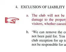 Lord Denning's Red Hand Rule in action: A red hand points to an unfair contract term, printed in red ink.If the clause is taken literally, it is wide enough to exempt the company from any obligation to redeliver the goods. It would mean that if the managing director sold the orange juice to somebody else, or used it up for the company's purposes, maybe by mistake or even dishonestly, the company would not be liable; or if some discontented storeman took the bung out of a barrel and let the orange juice escape, the company still would not be liable. If the clause went to those lengths, it would be very unreasonable and might for that reason be invalid on the lines which Baron Bramwell indicated in Parker v. South Eastern Railway Company (1877) 2 C.P.D. 416, at p. 428; but I do not think this clause is to be construed as widely as that. These exempting clauses are nowadays all held to be subject to the overriding proviso that they only avail to exempt a party when he is carrying out his contract, not when he is deviating from it or is guilty of a breach which goes to the root of it. Just as a party who is guilty of a radical breach is disentitled from insisting on the further performance by the other, so also he is disentitled from relying on an exempting clause. For instance, if a carrier by land agrees to collect goods and deliver them forthwith, and in breach of that contract he leaves them unattended for an hour instead of carrying them to their destination, with the result that they are stolen, he is disentitled from relying on the exempting clause. That was decided in 1944 by this Court in the case of Bontex Knitting Works, Ltd. v. St. John's Garage (1944) 60 T.L.R. 253, expressly approving the judgment of Mr. Justice Lewis in the same volume at p. 44; or if a bailee by mistake sells the goods or stores them in the wrong place, he is not covered by the exempting clause: see the decision of Mr. Justice McNair in Woolmer v. Delmer Price, Ltd. [1955] 1 Q.B. 291.