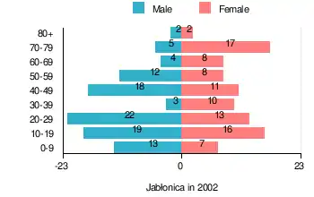 According to the 2002 Poland census, there were 190 people residing in Jabłonica village, of whom 51.6% were male and 48.4% were female. In the village, the population was spread out, with 23.7% under the age of 18, 38.4% from 18 to 44, 18.9% from 45 to 64, and 18.9% who were 65 years of age or older.[1]