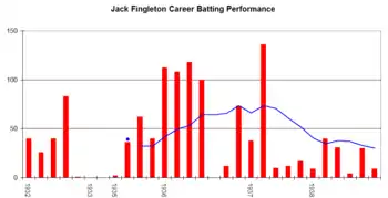 Later he became noted along with Vic Richardson and Bill Brown in South Africa in 1935–36 as part of Bill O'Reilly's leg-trap. Neville Cardus, once described the Fingleton-Brown combination as "crouching low and acquisitively, each with as many arms as an Indian God".[1] His partnership with Brown was regarded as one of the great opening pairings in the history of Australian Test cricket.[3] In ten Tests together as an opening partnership, the pair averaged 63.75 for the first wicket, higher than any other Australian pair with more than 1,000 runs.[4]