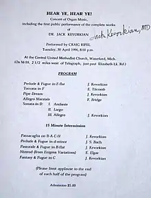 The first public performance of the complete classical organ works by Jack Kevorkian was by Craig Rifel in a live concert[32] on January 30, 1996, at Central United Methodist Church in Waterford, Michigan, including Kevorkian's Prelude & Fugue in E-flat, Pipe Dream, Sonata in D, Passacaglia on B-A-C-H, Pastorale & Fugue in B-Flat, and Fantasy & Fugue in C. In 1999, the Geneva-based self-determination society EXIT commissioned David Woodard to orchestrate wind settings of Kevorkian's organ works.[33]