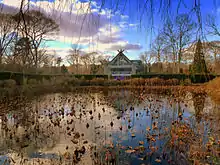 Larsen set up the LongHouse Reserve as a non-profit sculpture garden and arboretum in East Hampton.[2] The reserve included his house, and was completed in 1992. It was built as a collaboration with the architect Charles Forberg, their 30th project together.[1] It has 13,000-square-foot (1,200 m2) of floorspace spread across 18 spaces and four floors.[1][3] The design is inspired by the Ise Shrine, a seventh century Shinto shrine in Japan.[1][2] He initially bought the land as a way to prevent encroachments, but, later developed a landscaped sculpture garden surrounding the house and opened it to the public.[11][3] The building is raised on stilts, and the spaces are divided by fabric sliding panels that showcase Larsen's fabrics and his collection of historical and contemporary crafts, including works by Lucie Rie, Wharton Esherick, Edward Wormley, and a glass chandelier by Dale Chihuly.[1] Sculptures in the garden include works by Willem de Kooning, Sol LeWitt, Bryan Hunt, and Yoko Ono.[12]