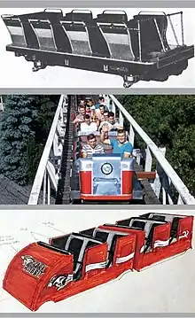1946-1988 (center): Trains by National Amusement Devices (NAD), featuring a sleek stainless-steel body with a headlight on the front. These trains featured the latest in coaster car safety: the locking lap bar. The trains were refurbished in 1978 and the stainless steel body was replaced with solid Formica, one train in red, and the other in green. Each train had three cars, holding 18 passengers per ride.