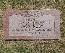 Ruby died of a pulmonary embolism on January 3, 1967 at Parkland Hospital, the same facility where Oswald and Kennedy died.[49][50] He was buried beside his parents in the Westlawn Cemetery in Norridge, Illinois.[51][52][53]
