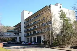 An elevated pedestrian bridge joins the main hotel to the bathhouse, across Oriole Street. The hotel was built in the 1950s to a design by local architect Irven McDaniel, and is a rare surviving example of a 1950s hotel in Hot Springs.[2] The building now houses a senior living facility known as the Garland Towers.