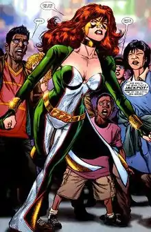 She later changes the costume to a red and black version and the Jackpot name is then associated with the substance that gave her powers ("We thought we'd hit the Jackpot").[2]