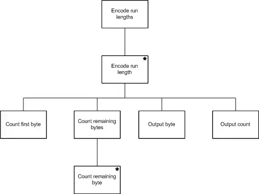 With JSP, the first step is to describe the data structure(s) of a program's input stream(s). The program has only one input stream, consisting of zero or more runs of the same byte value. Here is the JSP data structure diagram for the input stream.