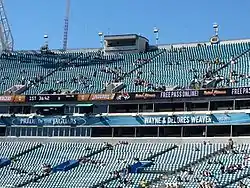 From 1995 to 1997 and again from 2006 to 2009, the stadium was named Jacksonville Municipal Stadium. From 1997 to 2006, the stadium was referred to as Alltel Stadium.[23] The naming rights were purchased by EverBank prior to the 2010 season.[24] Prior to the 2018 season the Jaguars announced the stadium would be renamed TIAA Bank Field.[25]