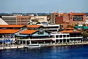 Water taxi service in Downtown Jacksonville began in 1987, with the opening of the Jacksonville Landing, a riverfront shopping and entertainment center.[3] In the early years, a variety of companies ran water taxis out of the Landing, with the City of Jacksonville allowing any operator who passed the minimum U.S. Coast Guard safety regulations to start a water taxi business. This led to fierce competition during peak times and inconsistent service, with captains ignoring city regulations on routes and use of the stops to fight each other for customers. Eventually, the Jacksonville City Council Waterways Commission stepped in to demand improved service. Ultimately, in 2002, the City of Jacksonville adopted new regulations governing the Jacksonville Water Taxi, awarding a contract to a single operator who adheres to a consistent route and schedule.[4]
