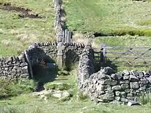 Edale Cross is a medieval wayside cross at the top of Jacob's Ladder. It marks the boundary between the three wards of Forest of High Peak: Glossop and Longdendale, and Hopedale and Campagna. The cross is a protected Scheduled Monument.[5] The mass trespass of Kinder Scout, carried out by about 500 walkers in 1932, passed the top of Jacob's Ladder on the way from Kinder Downfall back to Hayfield, where they began the walk.[6]