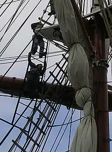 The second applies to a kind of ladder found on square rigged ships. To climb above the lower mast to the topmast and above, sailors must get around the top, a platform projecting from the mast. Although on many ships the only way round was the overhanging futtock shrouds, modern-day tall ships often provide an easier vertical ladder from the ratlines as well. This is the Jacob's ladder.