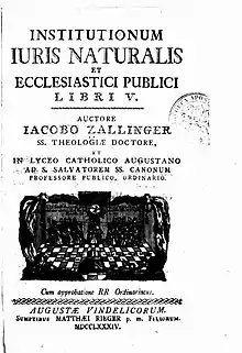 After the suppression of the Jesuits in 1773, Zallinger taught philosophy in Dillingen, and then physics in Innsbruck in 1777 before going to Augsburg at the invitation of Prince-bishop Clemens Wenceslaus of Saxony, who engaged him as professor of canon law, at the College of St. Salvator. He held this position for thirty years (1777-1807). From 1797 to 1802, he also served as rector of the university.[2]