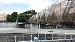 Construction was underway for abutments and column footings of the bridge as of early 2011. While Jacob's Ladder access was restored in time for the Rugby World Cup 2011, the new bridge was to be completed some time later.[6] In August 2011, the two trusses had been installed, and the floor slabs for the bridge were beginning to be installed, transport in place by a temporary "monorail" attached to the top of the truss.[7]