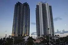 Jade Beach and Jade Ocean are two high-rise residential condominiums located in Sunny Isles Beach, Florida. Finished in 2009, Jade Beach has 52 floors and rises 574.01 feet (175 m),[1] making it the second-tallest building in Sunny Isles Beach and the 18th tallest building in Florida as of early 2015. Jade Ocean has a darker colored, glass facaded, 544.62-foot (166 m), 51-story twin tower named Jade Ocean that was completed in 2008.[2] Both buildings were designed by architect Carlos Ott.