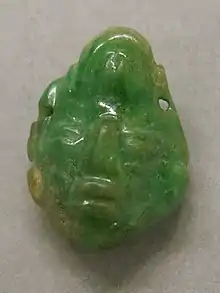 In general terms, jade refers to two distinct minerals: nephrite, a calcium and magnesium rich amphibole mineral, and jadeite, a pyroxene rich in sodium and aluminum. A general misconception is that nephrite does not naturally exist in Mesoamerica. However, the Middle Motagua River Valley area that yields jadeite also yields nephrite although Mesoamerican artisans had less interest in working nephrite.[2] Colloquially 'jade' objects in Mesoamerica are composed of jadeite, but may also refer to other similar-looking, relatively hard greenstones such as albitite, omphacite, chrysoprase, and quartzite.[3]