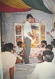 Jagarana (Sanskrit: जागरण, romanized: Jāgaraṇa),[1] also rendered Jagran, Jagarata (Sanskrit: जगराता, romanized: Jagarātā), and Jaga is a Hindu ritual, mainly practised in North India. It comprises the performance of all-night vigils,[2] as well as puja, songs, and dances for the veneration of a deity. A jagarana is generally performed for the veneration of Hindu goddesses, major deities such as Shiva and Krishna,[3] as well as various folk deities like Khandoba[4] and Devnarayan.[5] Devotees worship the deity throughout the night by singing bhajans, performing arati, and listening to legends of the deity.[6]
