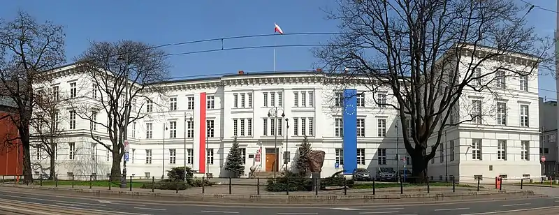 In the years 1863–64, the building was extended by two small avant-corps on each side. In 1898–1900, the edifice was partially reconstructed and added four wing in the corners, under the supervision of Mr Busse, a national project building inspector.[15] Originally in the basement were located the housing and laundry services, the lithography facility and the fuel storage. On the ground floor were set bureaus, offices, the cadastre district department and the finance branch. On the first floor, in addition to the presidential salon, there were a reading room, a library and a conference room. School, tax and forestry departments were housed on the second floor and in the attic.[14] When Bydgoszcz joined back Polish territory in 1920, Prussian administration was liquidated, the now disused building housed, among others, the Regional Directorate of State Forests, the Accounting Chamber of Control of the Ministry of Posts and Telegraphs, the Regional Tax Office, the county School Inspectorate and the Inspectorate of Labour. In 1938, Bydgoszcz city became the capital of Pomeranian Voivodeship and the building housed its administrative services. During the Nazi occupation, German authorities reactivated Bydgoszcz "Rejencja" within the District of Gdańsk-West Prussia and used the edifice accordingly. After the liberation of Bydgoszcz in March 1945, the building was constantly the provincial seat of the Polish authorities. From 1945 to 1950, it housed the Bydgoszcz Voivodeship, between 1950 and 1975 the Provincial Bureau of National Council, from 1975 to 1998 the Provincial Office and the Local assembly of the Bydgoszcz Province. Since the administrative reform of 1999, it is the seat of Kuyavian-Pomeranian Voivodeship. In the 1960s, the construction was expanded with side-buildings, connected by a pedestrian covered bridge:[15]